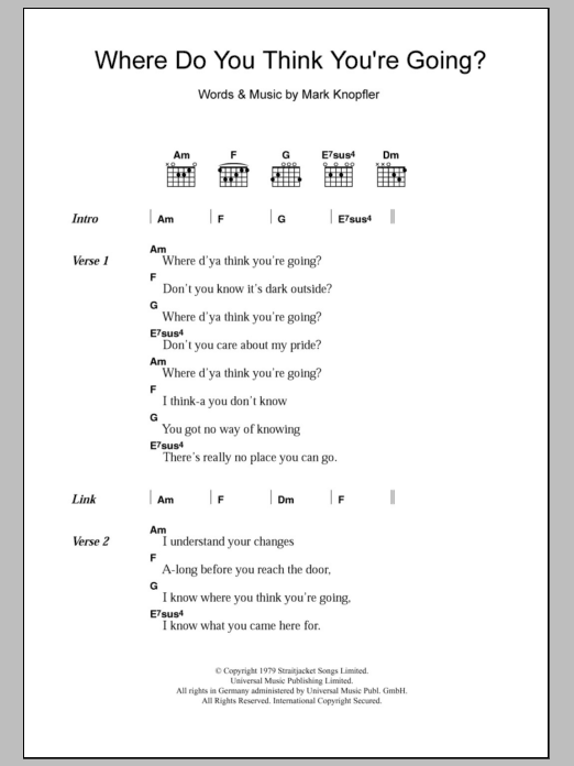 Download or print Dire Straits Where Do You Think You're Going sheet music, chords and digital score arranged for Guitar Chords/Lyrics. This Rock score includes 2 page(s).