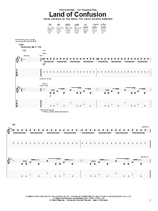 Download or print Disturbed Land Of Confusion sheet music, chords and digital score arranged for Guitar Tab. This Pop score includes 9 page(s).