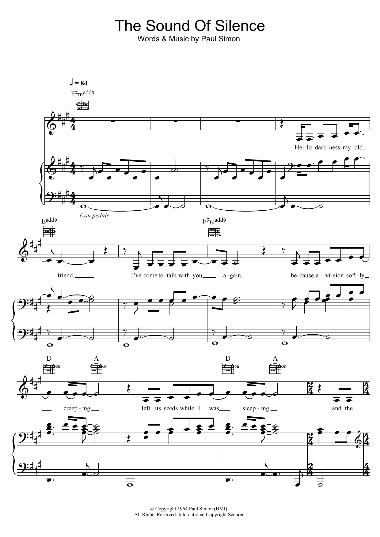 Download or print Disturbed The Sound Of Silence sheet music, chords and digital score arranged for Piano, Vocal & Guitar Chords (Right-Hand Melody). This Pop score includes 6 page(s).