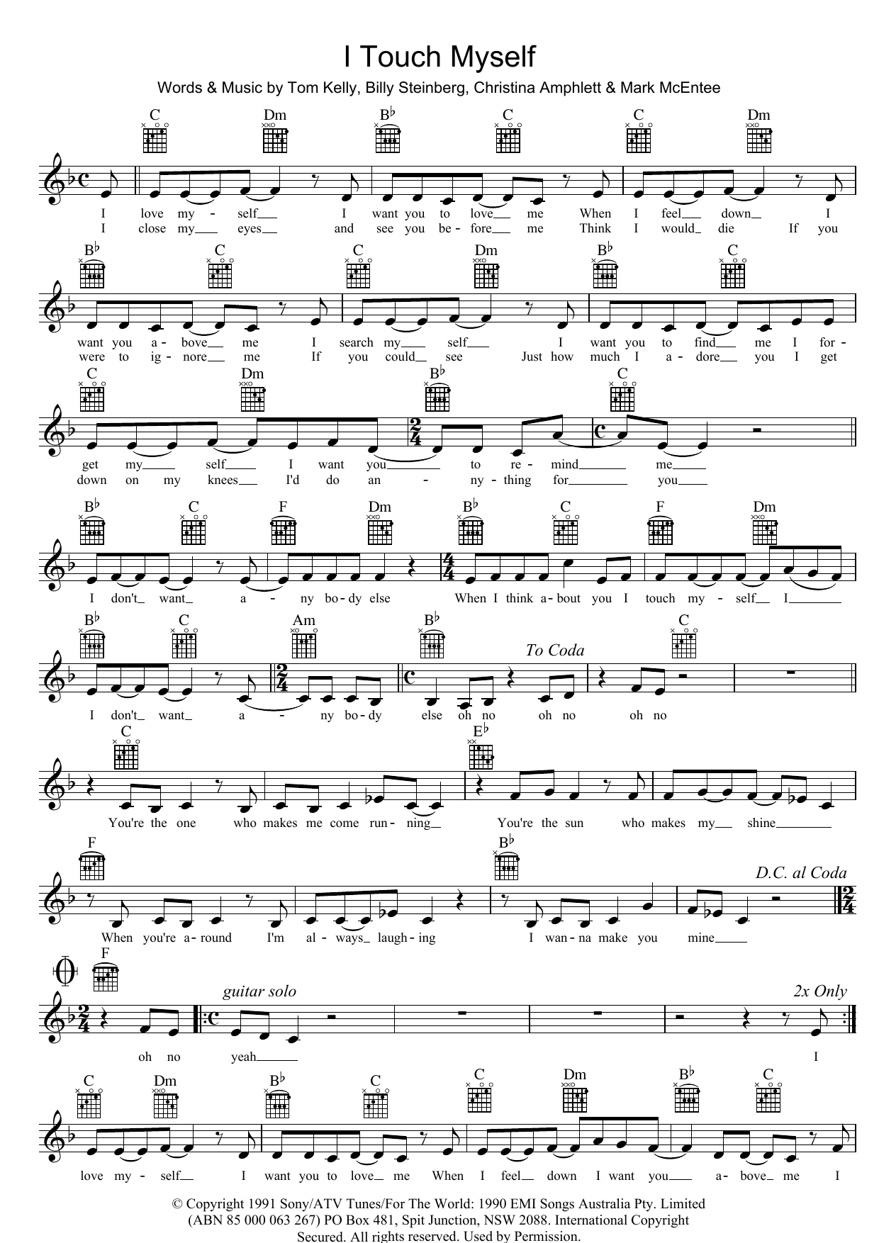Download or print Divinyls I Touch Myself sheet music, chords and digital score arranged for Lead Sheet / Fake Book. This Pop score includes 2 page(s).