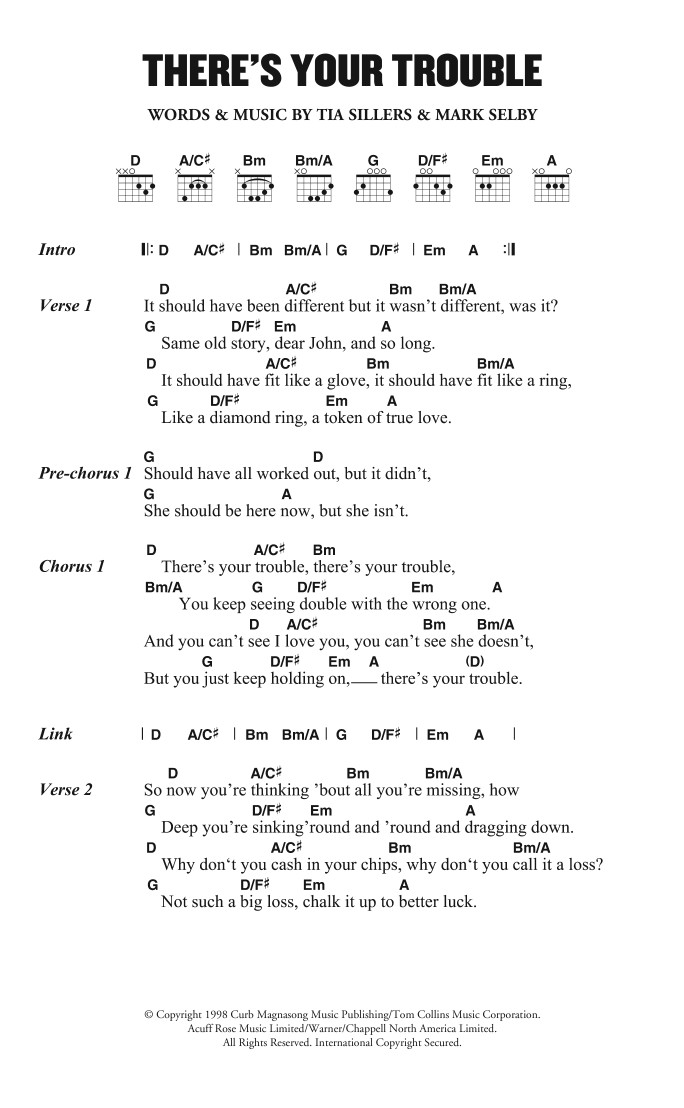 Download or print The Chicks There's Your Trouble sheet music, chords and digital score arranged for Guitar Chords/Lyrics. This Country score includes 2 page(s).