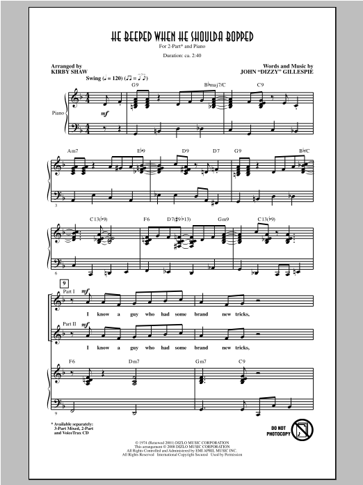 Download or print Kirby Shaw He Beeped When He Shoulda Bopped sheet music, chords and digital score arranged for 3-Part Mixed Choir. This Concert score includes 11 page(s).
