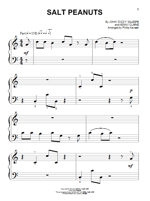 Download or print Dizzy Gillespie Salt Peanuts (arr. Phillip Keveren) sheet music, chords and digital score arranged for Beginning Piano Solo. This Jazz score includes 2 page(s).