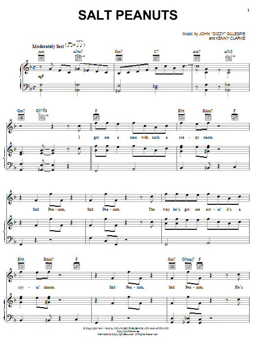 Download or print Dizzy Gillespie Salt Peanuts sheet music, chords and digital score arranged for Piano Solo. This Jazz score includes 4 page(s).
