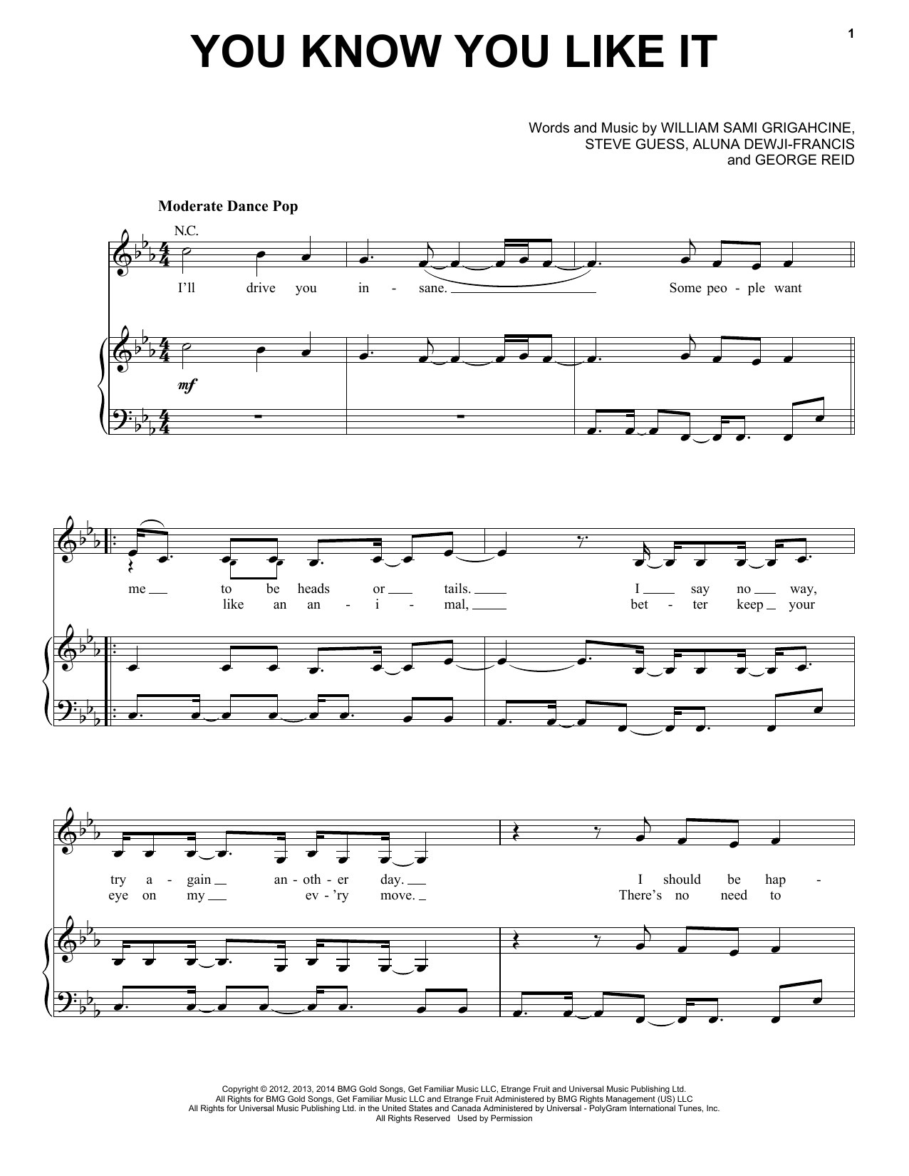 Download or print DJ Snake & AlunaGeorge You Know You Like It sheet music, chords and digital score arranged for Piano, Vocal & Guitar Chords (Right-Hand Melody). This Pop score includes 6 page(s).