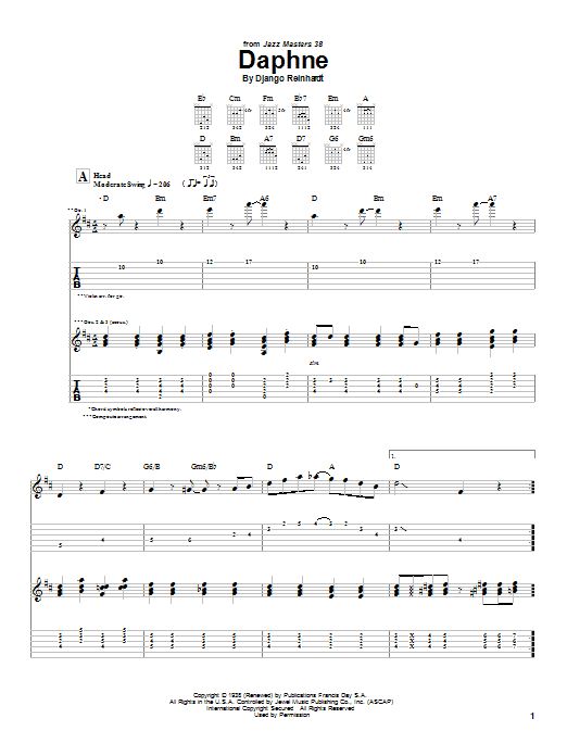 Download or print Django Reinhardt Daphne sheet music, chords and digital score arranged for Guitar Tab. This Jazz score includes 8 page(s).