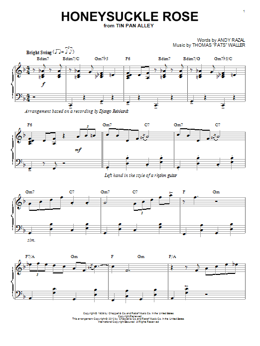 Download or print Django Reinhardt Honeysuckle Rose (arr. Brent Edstrom) sheet music, chords and digital score arranged for Piano Solo. This Jazz score includes 4 page(s).
