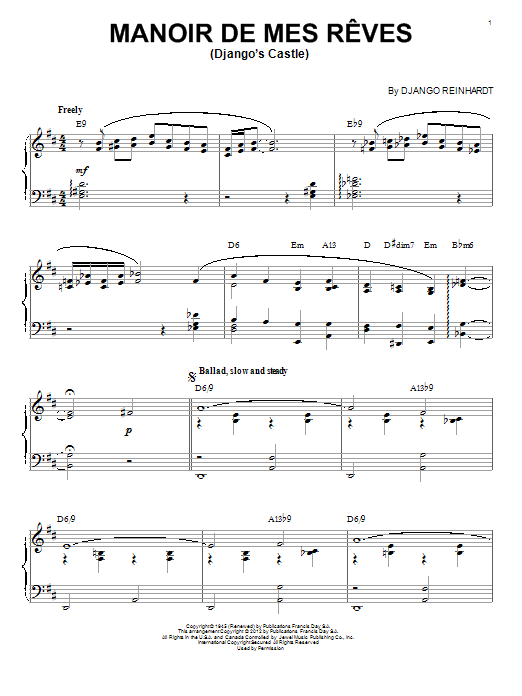 Download or print Django Reinhardt Manoir De Mes Reves (Django's Castle) (arr. Brent Edstrom) sheet music, chords and digital score arranged for Piano Solo. This Jazz score includes 4 page(s).
