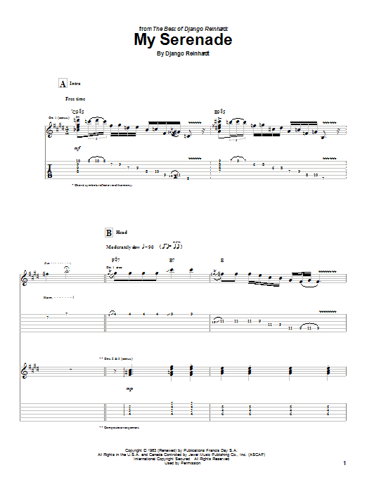 Download or print Django Reinhardt My Serenade sheet music, chords and digital score arranged for Guitar Tab. This Jazz score includes 7 page(s).