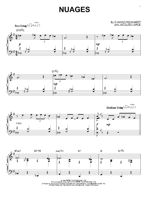 Download or print Django Reinhardt Nuages (arr. Brent Edstrom) sheet music, chords and digital score arranged for Piano Solo. This Jazz score includes 5 page(s).