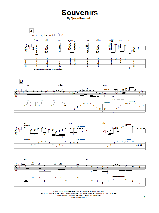 Download or print Django Reinhardt Souvenirs sheet music, chords and digital score arranged for Guitar Tab (Single Guitar). This Jazz score includes 5 page(s).