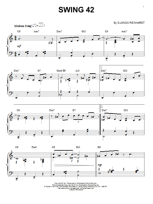 Download or print Django Reinhardt Swing 42 (arr. Brent Edstrom) sheet music, chords and digital score arranged for Piano Solo. This Jazz score includes 5 page(s).