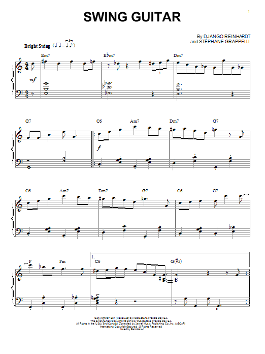 Download or print Django Reinhardt Swing Guitar (arr. Brent Edstrom) sheet music, chords and digital score arranged for Piano Solo. This Jazz score includes 3 page(s).