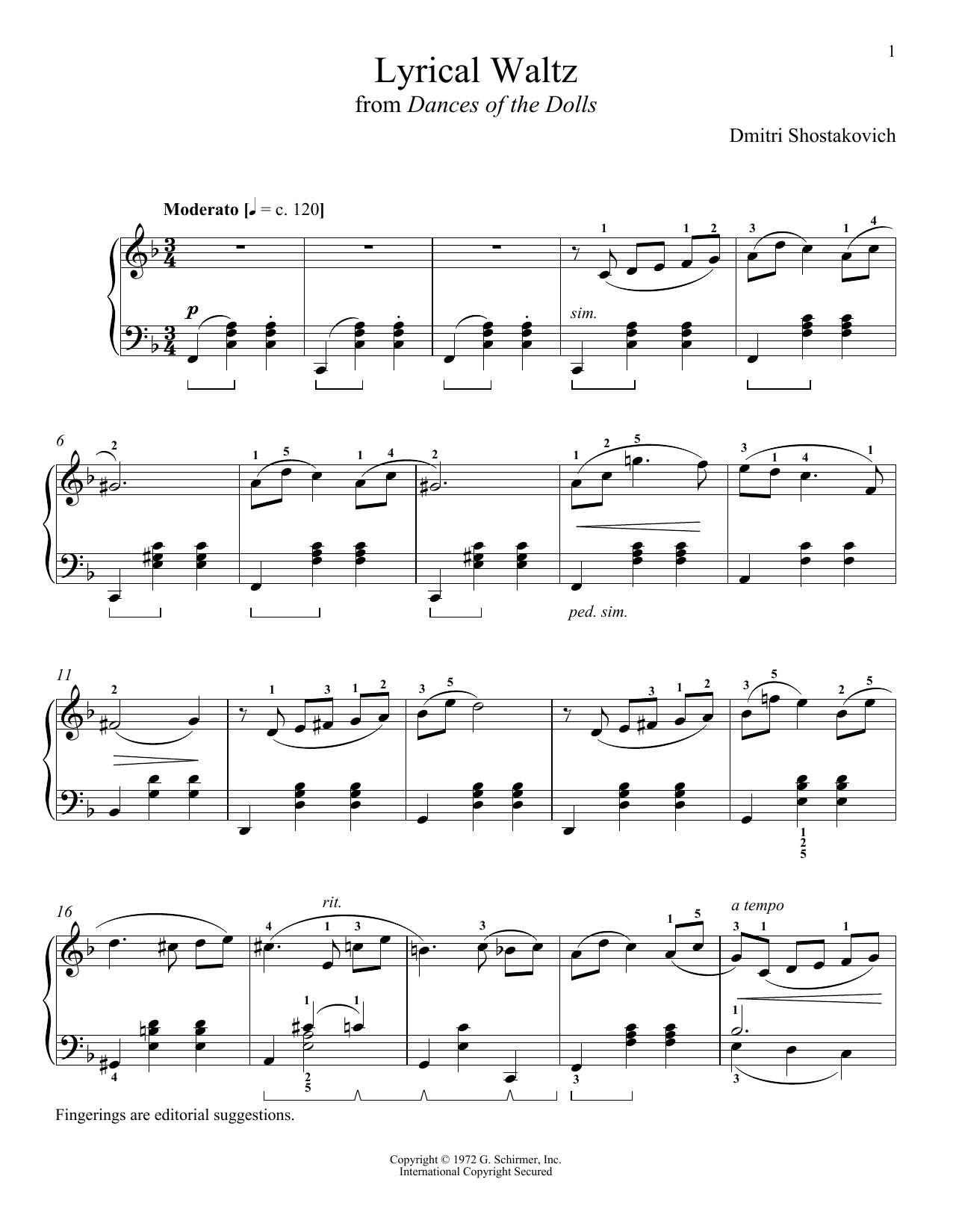 Download or print Dmitri Shostakovich Lyrical Waltz sheet music, chords and digital score arranged for Piano Solo. This Classical score includes 4 page(s).