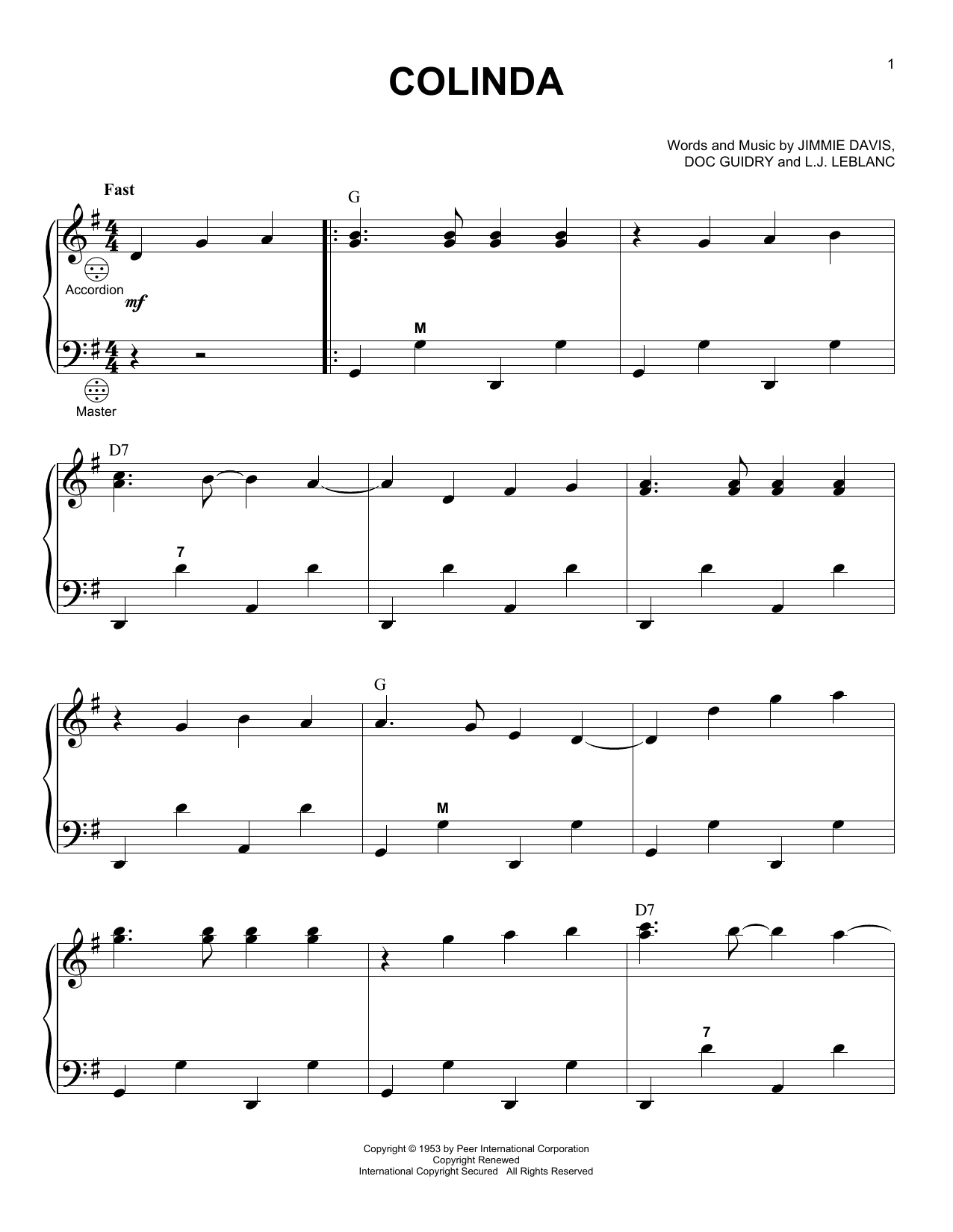Download or print Doc Guidry Colinda sheet music, chords and digital score arranged for Accordion. This Cajun score includes 4 page(s).