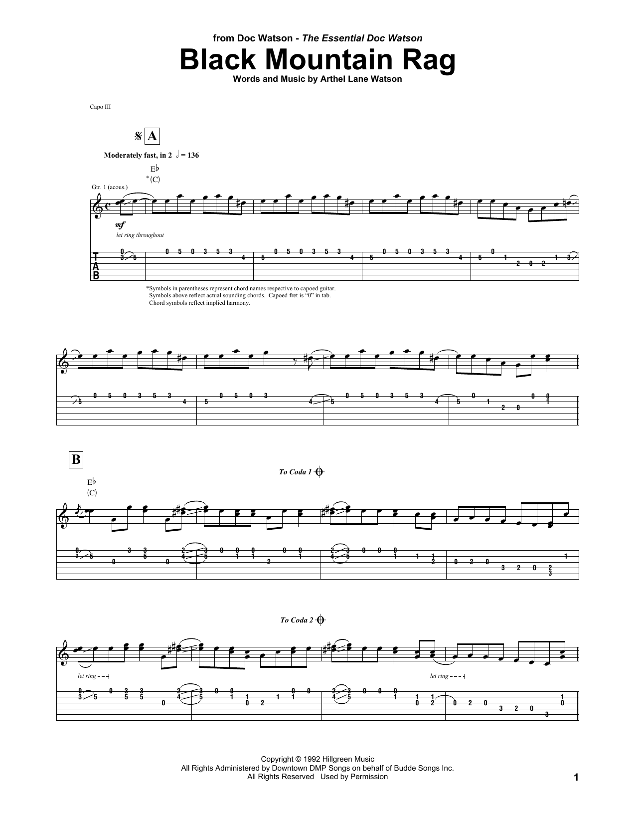 Download or print Doc Watson Black Mountain Rag sheet music, chords and digital score arranged for Guitar Tab. This Country score includes 4 page(s).