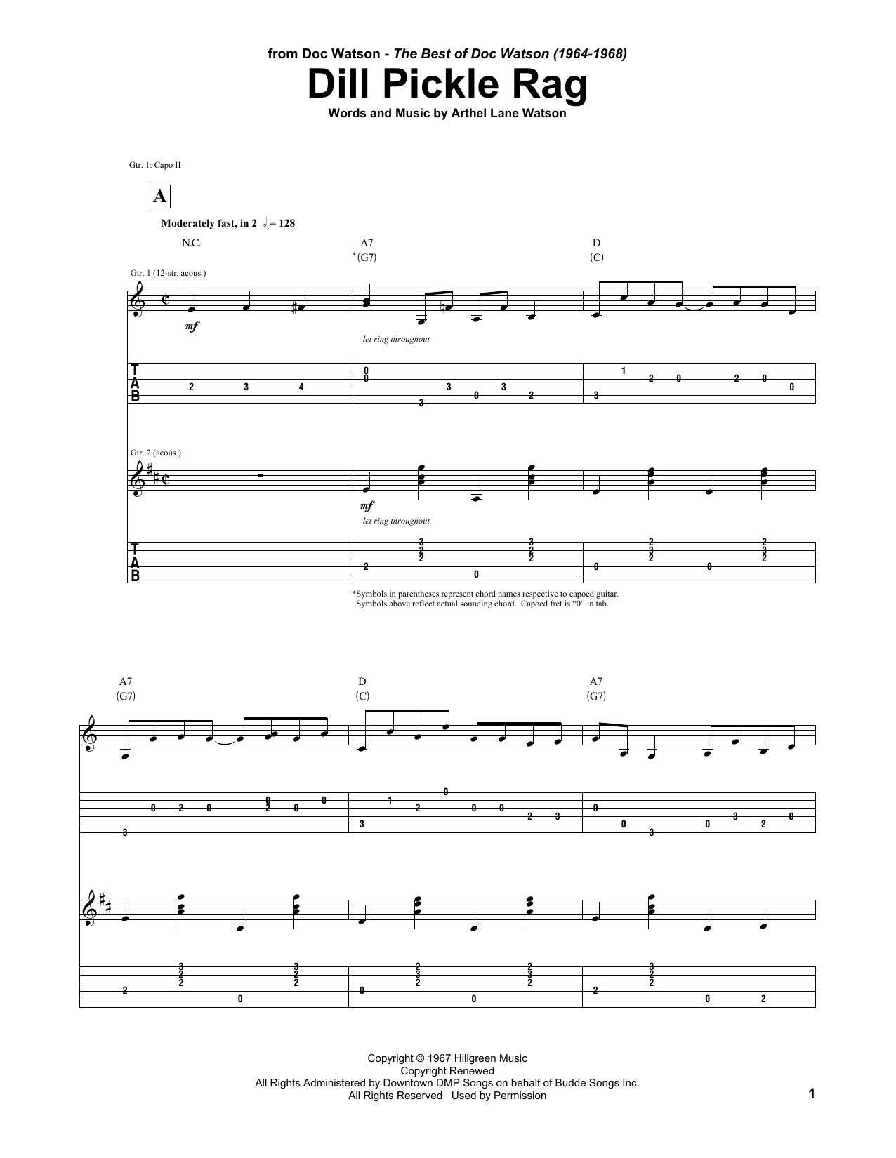 Download or print Doc Watson Dill Pickle Rag sheet music, chords and digital score arranged for Guitar Tab. This Country score includes 6 page(s).