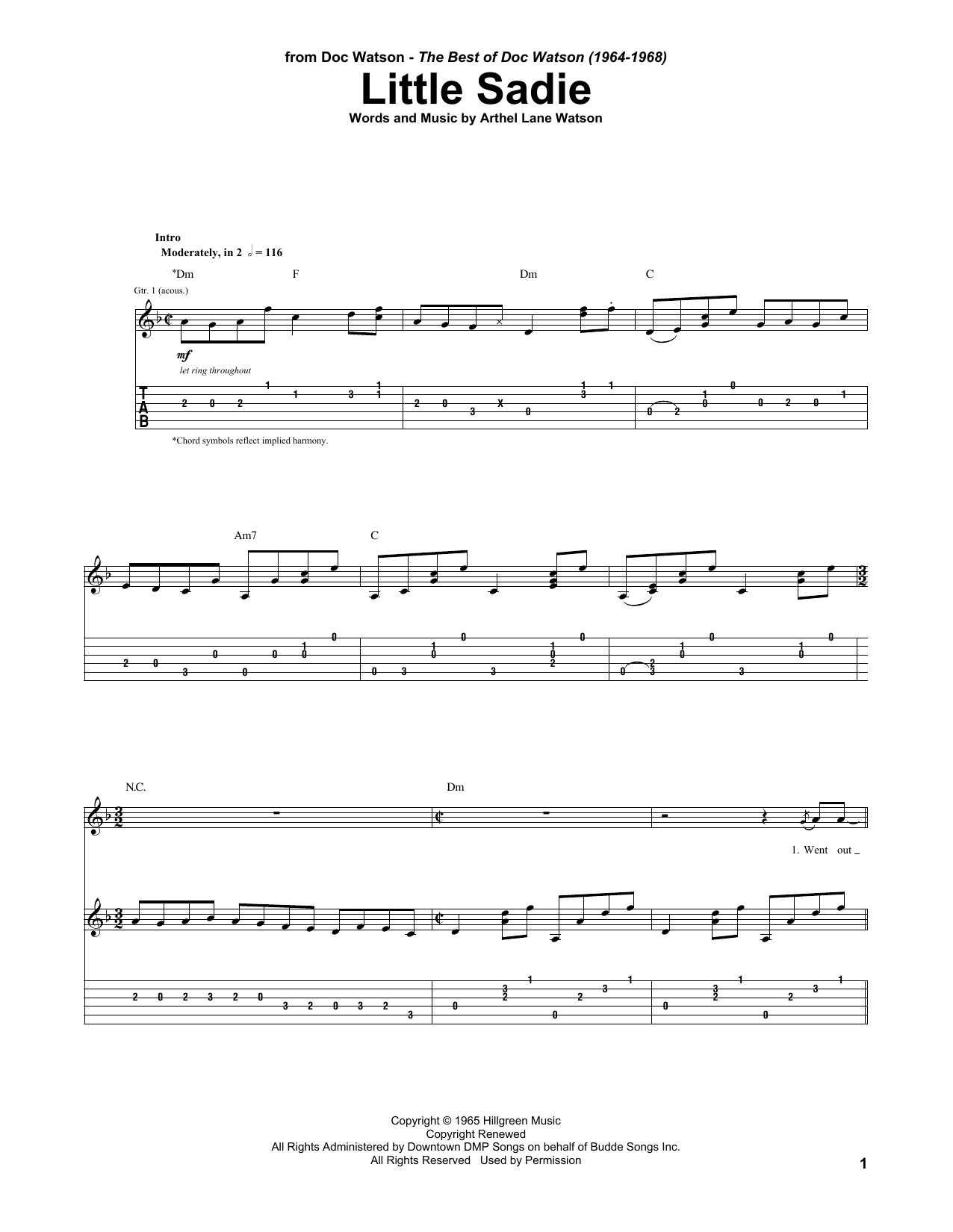 Download or print Doc Watson Little Sadie sheet music, chords and digital score arranged for Guitar Tab. This Country score includes 7 page(s).