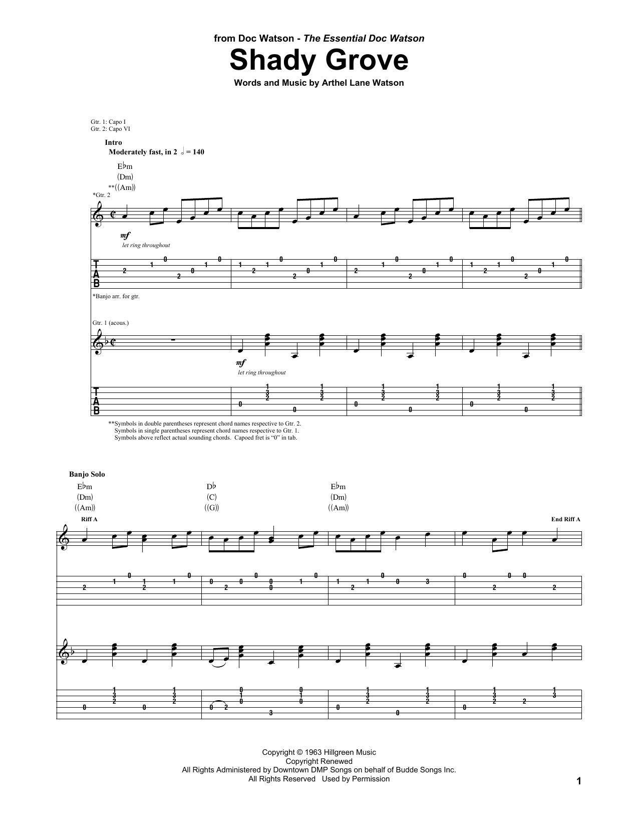 Download or print Doc Watson Shady Grove sheet music, chords and digital score arranged for Guitar Tab. This Country score includes 8 page(s).