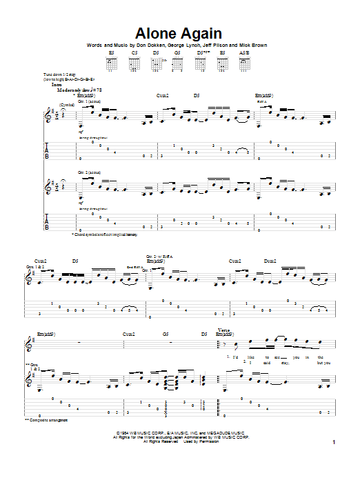 Download or print Dokken Alone Again sheet music, chords and digital score arranged for Guitar Tab. This Pop score includes 6 page(s).