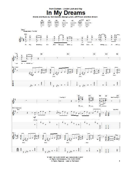 Download or print Dokken In My Dreams sheet music, chords and digital score arranged for Guitar Tab (Single Guitar). This Pop score includes 10 page(s).