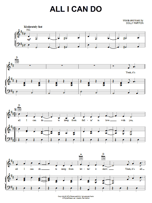 Download or print Dolly Parton All I Can Do sheet music, chords and digital score arranged for Piano, Vocal & Guitar Chords (Right-Hand Melody). This Country score includes 4 page(s).