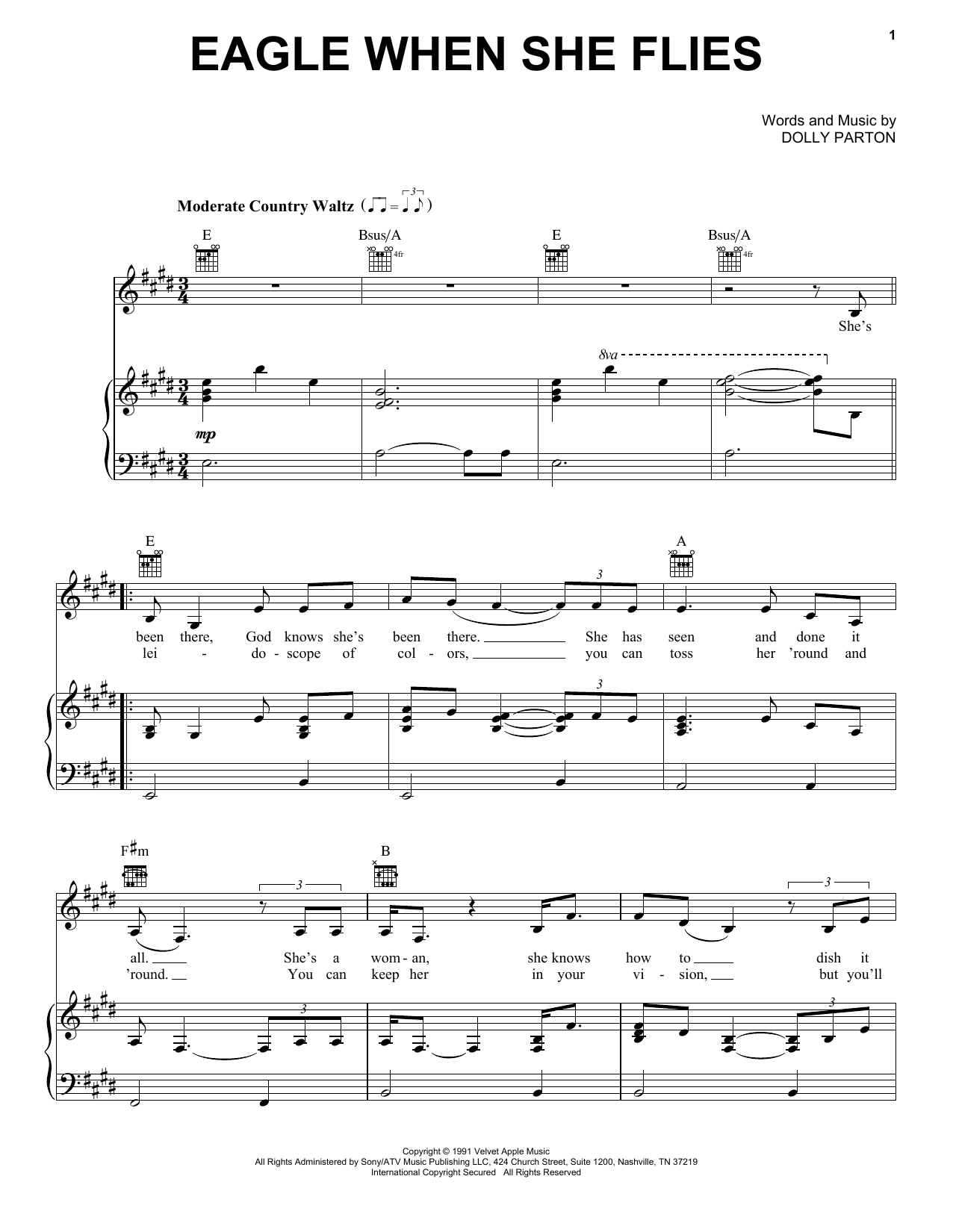 Download or print Dolly Parton Eagle When She Flies sheet music, chords and digital score arranged for Piano, Vocal & Guitar Chords (Right-Hand Melody). This Country score includes 4 page(s).