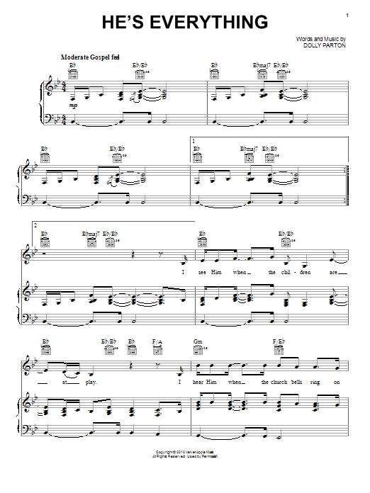 Download or print Dolly Parton He's Everything sheet music, chords and digital score arranged for Piano, Vocal & Guitar Chords (Right-Hand Melody). This Film/TV score includes 9 page(s).
