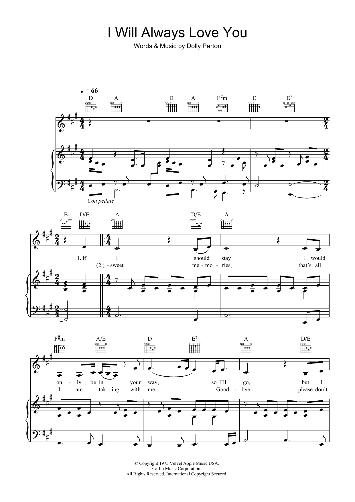 Download or print Dolly Parton I Will Always Love You sheet music, chords and digital score arranged for Very Easy Piano. This Country score includes 2 page(s).