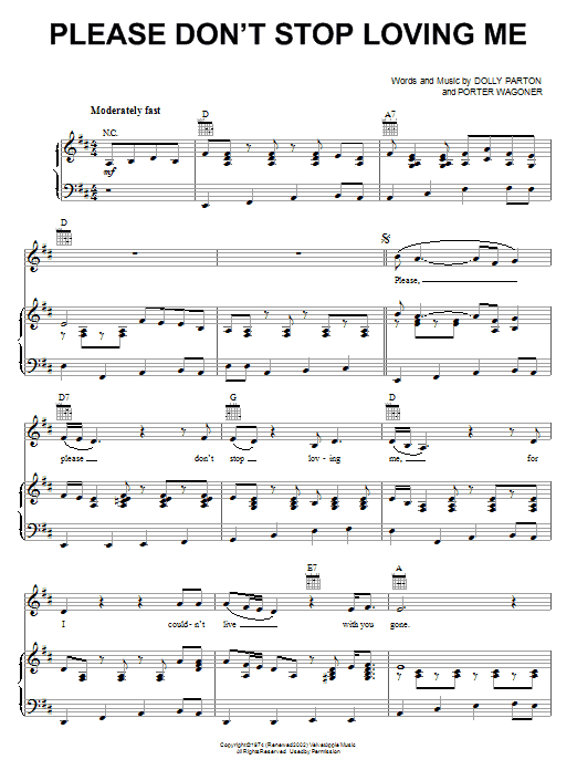 Download or print Dolly Parton Please Don't Stop Loving Me sheet music, chords and digital score arranged for Piano, Vocal & Guitar Chords (Right-Hand Melody). This Country score includes 4 page(s).