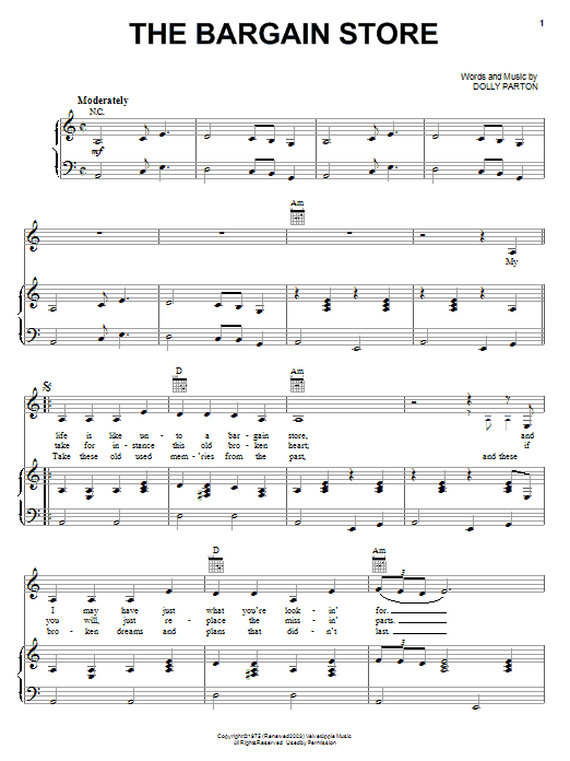 Download or print Dolly Parton The Bargain Store sheet music, chords and digital score arranged for Piano, Vocal & Guitar Chords (Right-Hand Melody). This Country score includes 5 page(s).