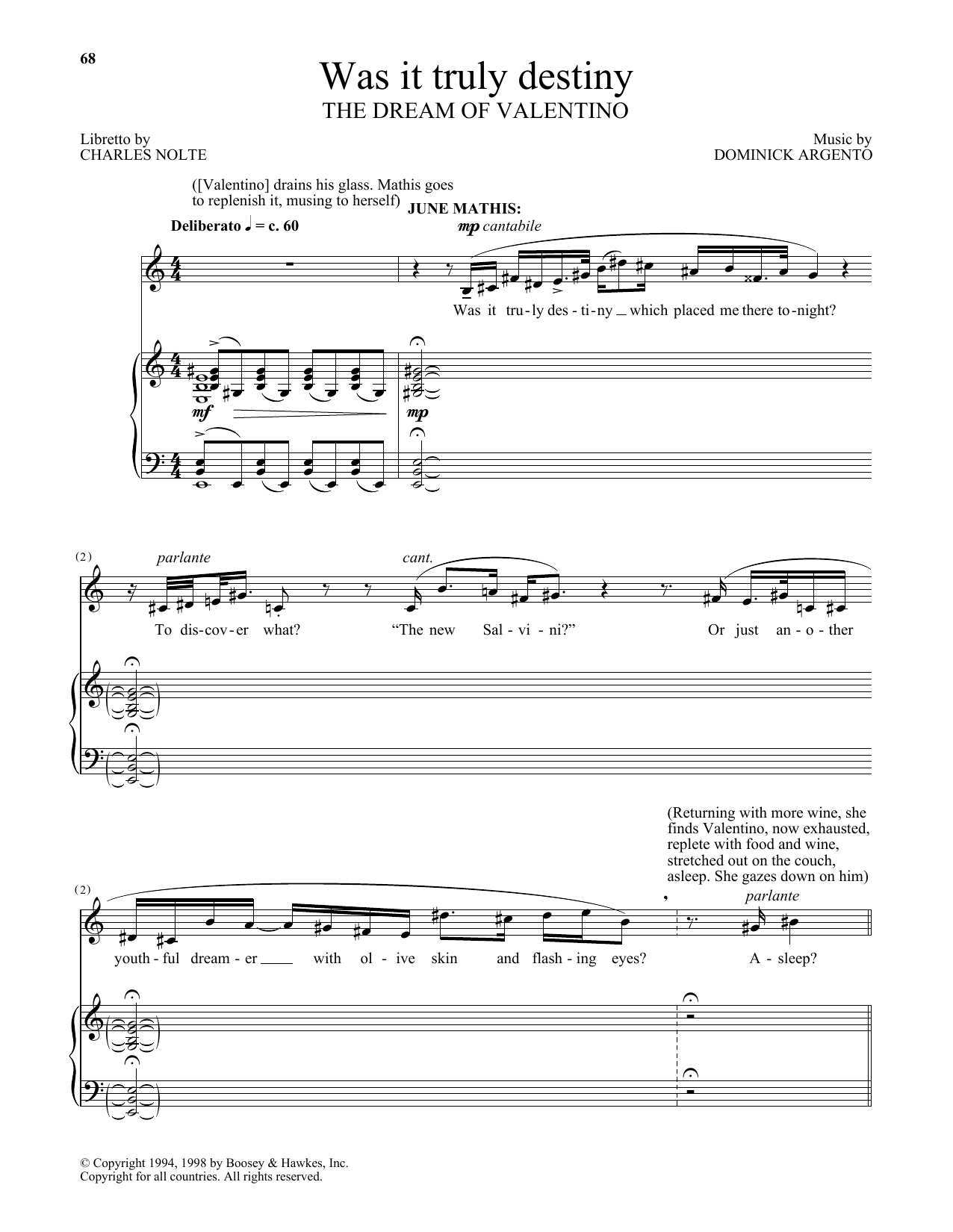 Download or print Dominick Argento Was it truly destiny (from The Dream Of Valentino) sheet music, chords and digital score arranged for Piano & Vocal. This Classical score includes 6 page(s).