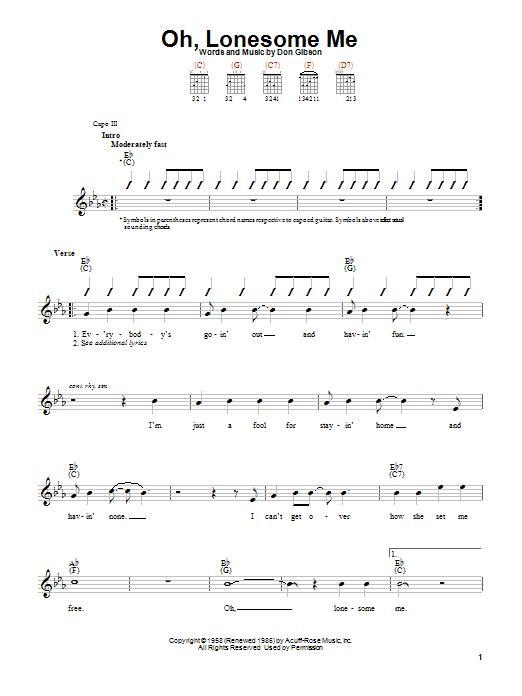 Download or print Don Gibson Oh, Lonesome Me sheet music, chords and digital score arranged for Super Easy Piano. This Country score includes 2 page(s).