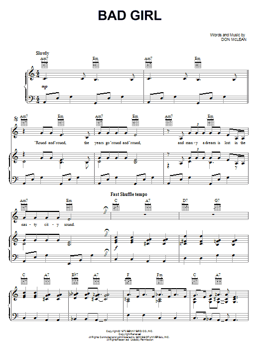 Download or print Don McLean Bad Girl sheet music, chords and digital score arranged for Piano, Vocal & Guitar Chords (Right-Hand Melody). This Folk score includes 5 page(s).
