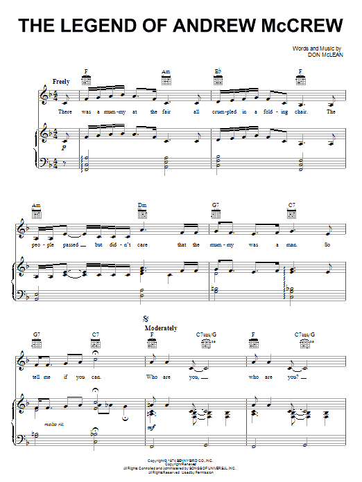 Download or print Don McLean The Legend Of Andrew McCrew sheet music, chords and digital score arranged for Piano, Vocal & Guitar Chords (Right-Hand Melody). This Folk score includes 8 page(s).