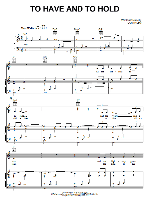 Download or print Don McLean To Have And To Hold sheet music, chords and digital score arranged for Piano, Vocal & Guitar Chords (Right-Hand Melody). This Folk score includes 7 page(s).