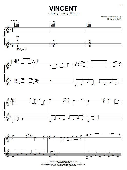 Download or print Don McLean Vincent (Starry Starry Night) sheet music, chords and digital score arranged for Piano, Vocal & Guitar Chords (Right-Hand Melody). This Pop score includes 4 page(s).