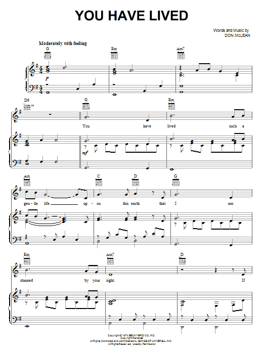 Download or print Don McLean You Have Lived sheet music, chords and digital score arranged for Piano, Vocal & Guitar Chords (Right-Hand Melody). This Folk score includes 6 page(s).