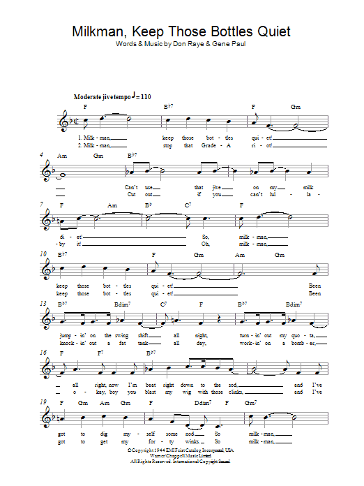 Download or print Ella Mae Morse Milkman, Keep Those Bottles Quiet sheet music, chords and digital score arranged for Lead Sheet / Fake Book. This Standards score includes 2 page(s).