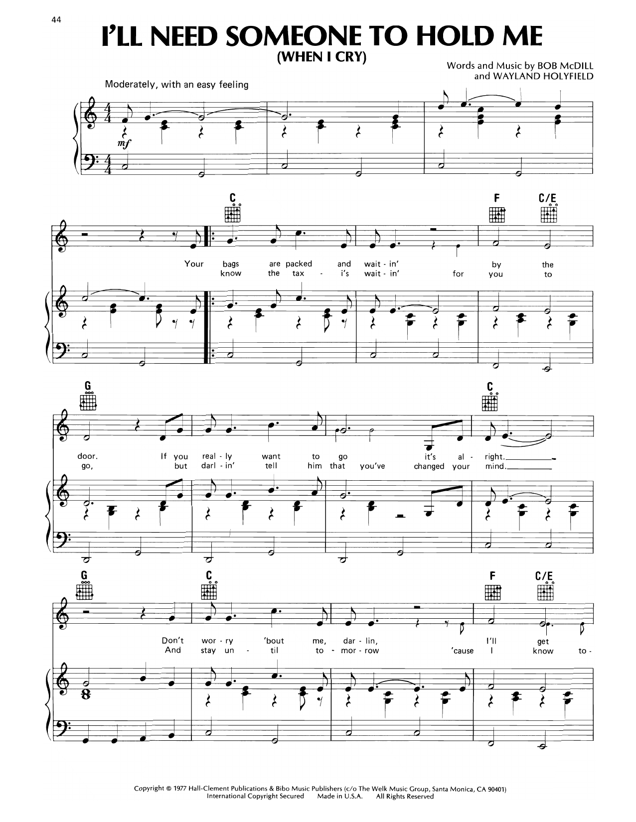 Download or print Don Williams I'll Need Someone To Hold Me (When I Cry) sheet music, chords and digital score arranged for Piano, Vocal & Guitar Chords (Right-Hand Melody). This Country score includes 3 page(s).