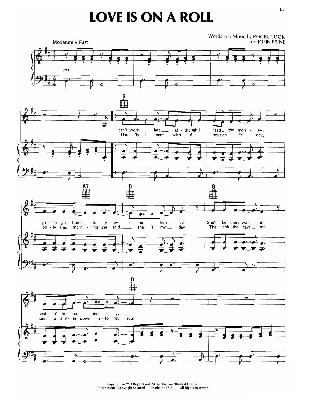 Download or print Don Williams Love Is On A Roll sheet music, chords and digital score arranged for Piano, Vocal & Guitar Chords (Right-Hand Melody). This Country score includes 5 page(s).
