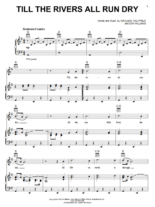 Download or print Don Williams Till The Rivers All Run Dry sheet music, chords and digital score arranged for Piano, Vocal & Guitar Chords (Right-Hand Melody). This Country score includes 3 page(s).
