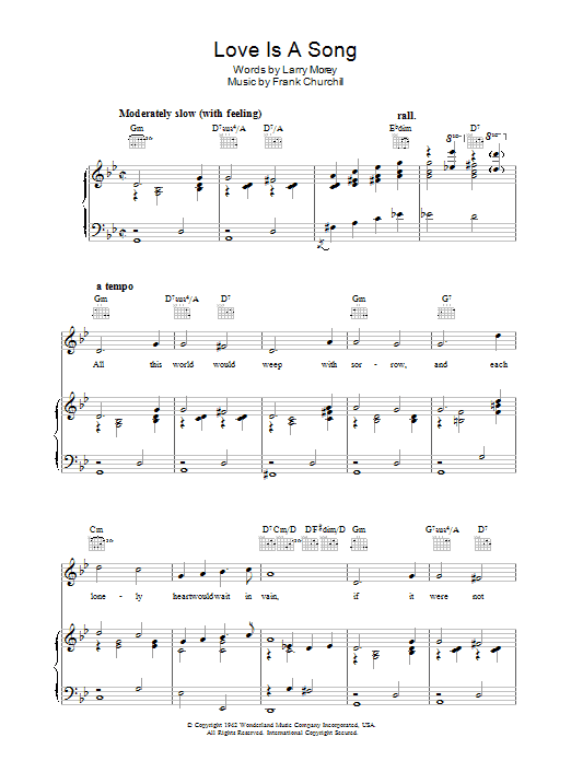 Download or print Frank Churchill Love Is A Song (from Walt Disney's Bambi) sheet music, chords and digital score arranged for Piano, Vocal & Guitar Chords. This Film/TV score includes 4 page(s).