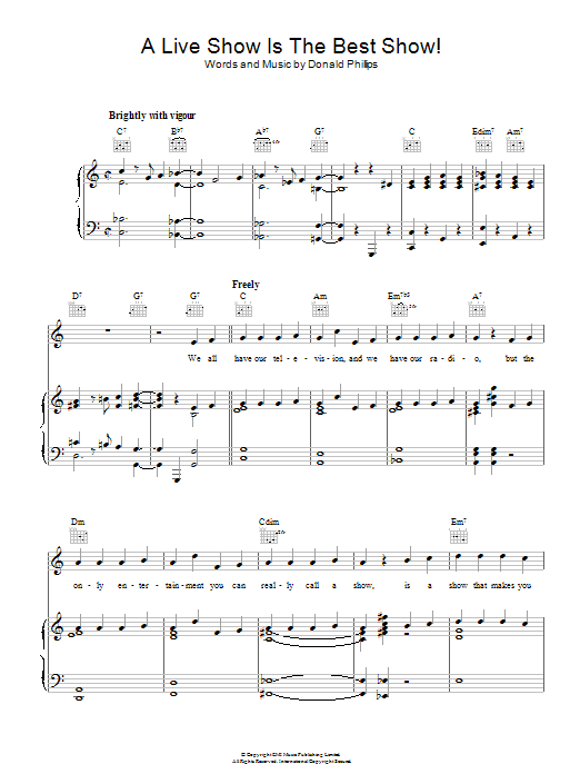 Download or print Donald Phillips A Live Show Is The Best Show sheet music, chords and digital score arranged for Piano, Vocal & Guitar Chords. This Standards score includes 5 page(s).