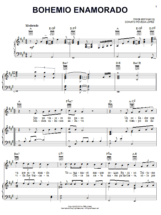 Download or print Donato Poveda Lopez Bohemio Enamorado sheet music, chords and digital score arranged for Piano, Vocal & Guitar Chords (Right-Hand Melody). This Latin score includes 5 page(s).