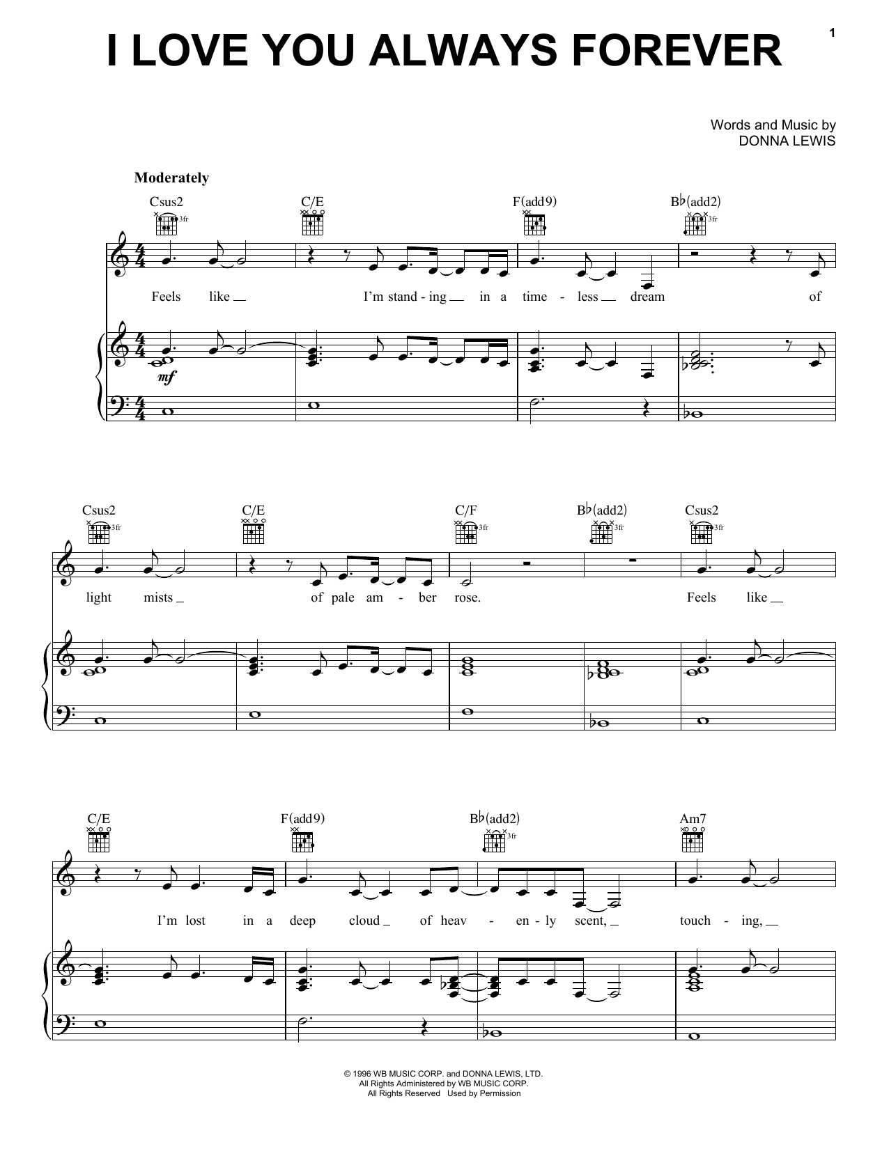 Download or print Donna Lewis I Love You Always Forever sheet music, chords and digital score arranged for Piano, Vocal & Guitar Chords (Right-Hand Melody). This Love score includes 5 page(s).