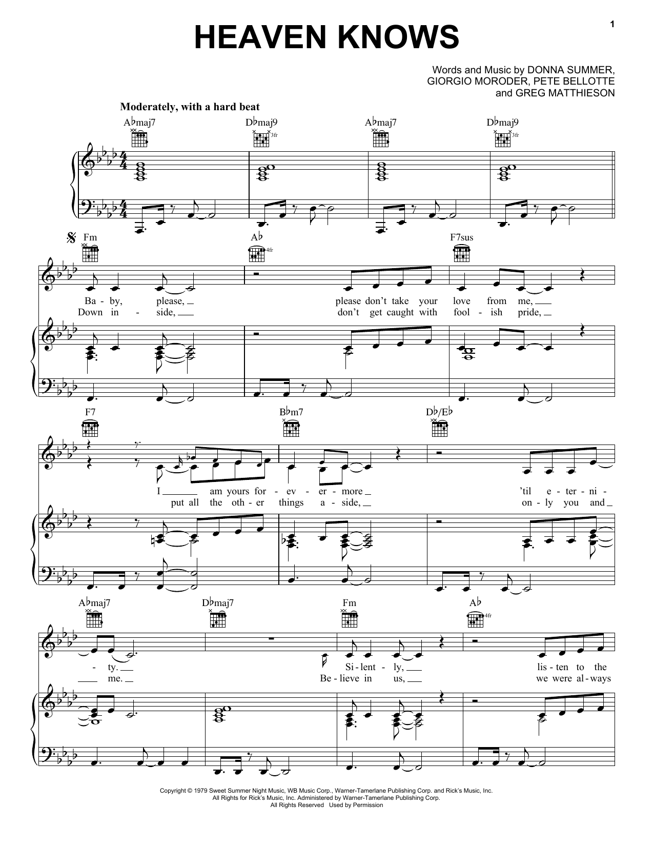 Download or print Donna Summer Heaven Knows sheet music, chords and digital score arranged for Piano, Vocal & Guitar Chords (Right-Hand Melody). This Disco score includes 4 page(s).