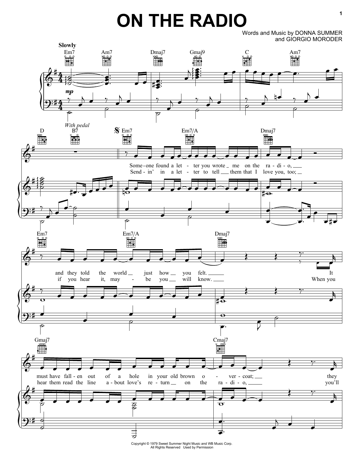 Download or print Donna Summer On The Radio sheet music, chords and digital score arranged for Piano, Vocal & Guitar Chords (Right-Hand Melody). This Pop score includes 7 page(s).