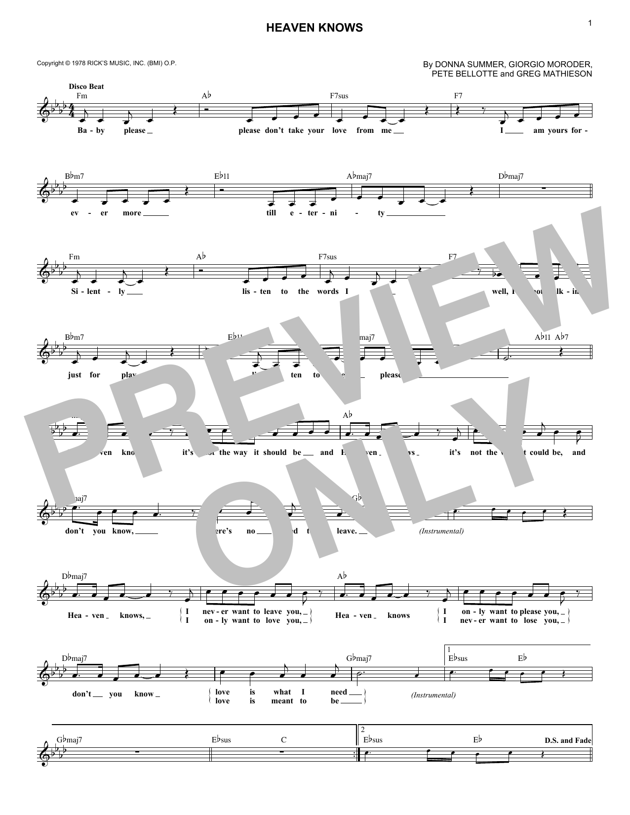 Download or print Donna Summer w/Brooklyn Dreams Heaven Knows sheet music, chords and digital score arranged for Lead Sheet / Fake Book. This Disco score includes 1 page(s).