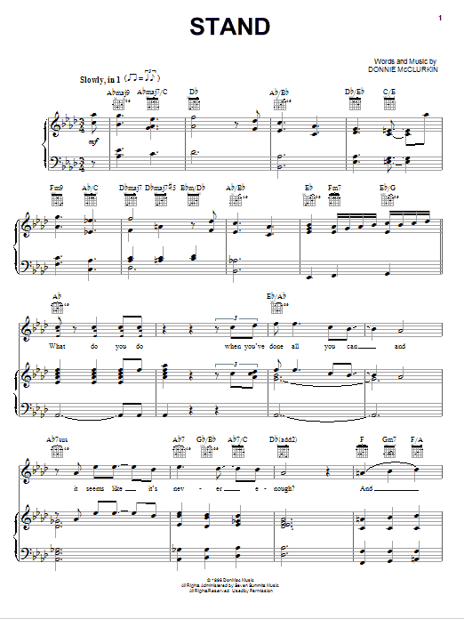 Download or print Donnie McClurkin Stand sheet music, chords and digital score arranged for Piano, Vocal & Guitar Chords (Right-Hand Melody). This Christian score includes 11 page(s).
